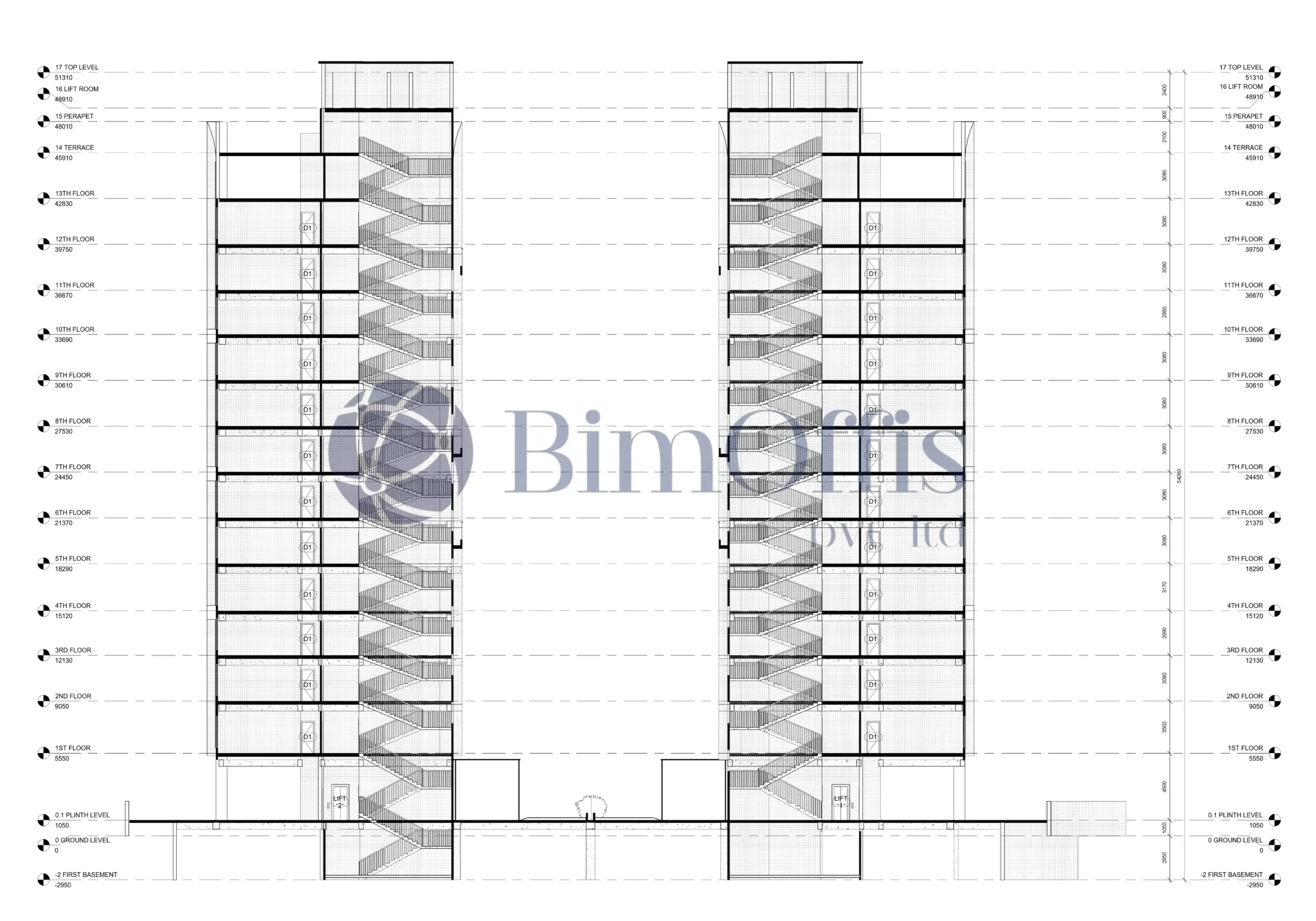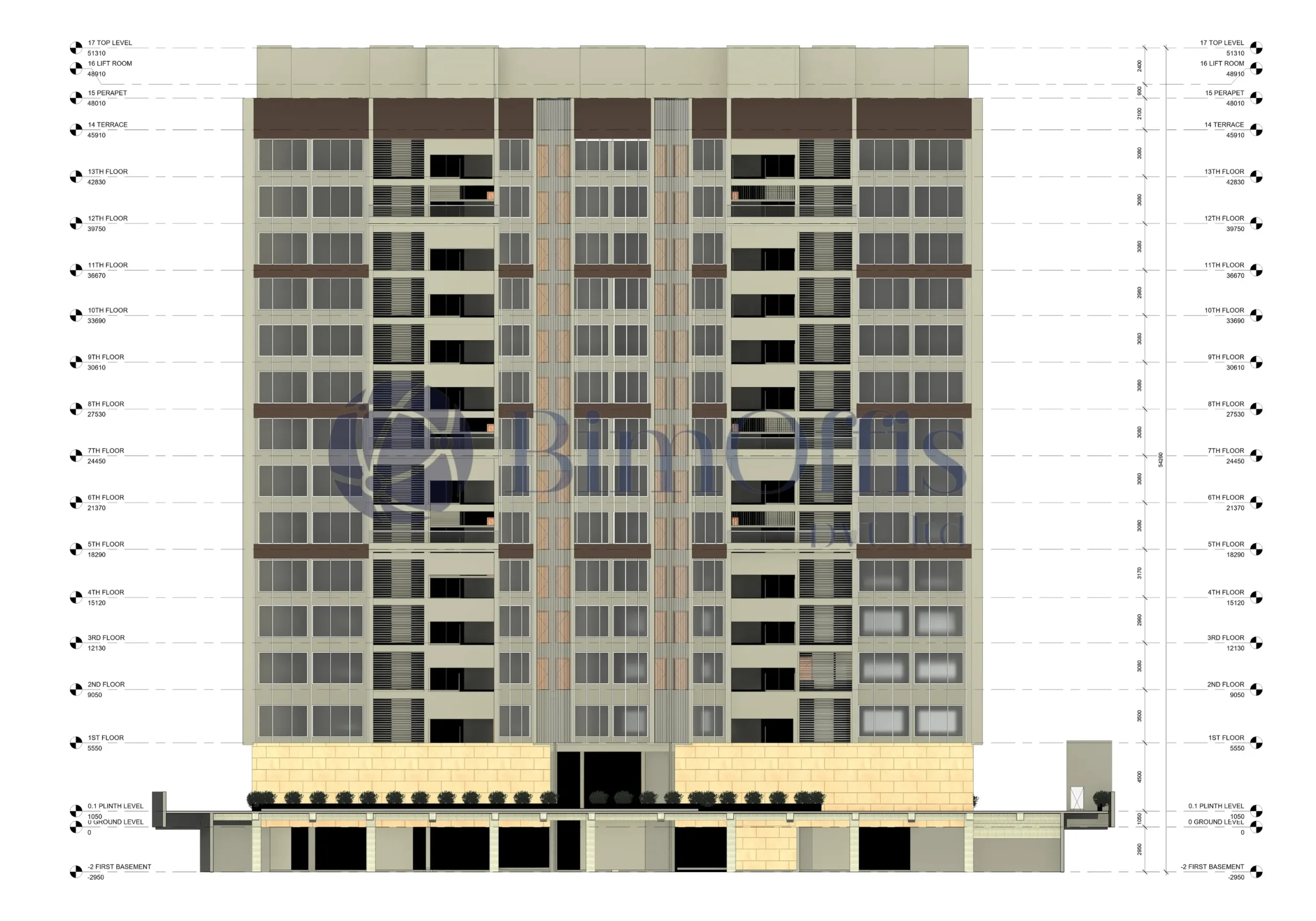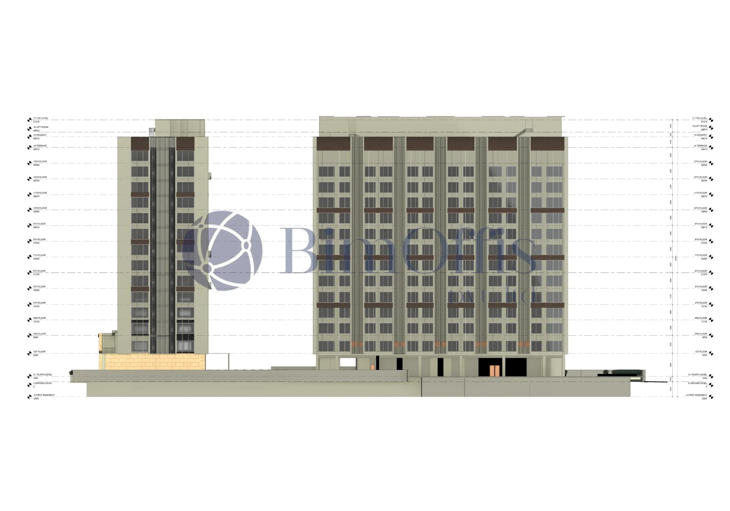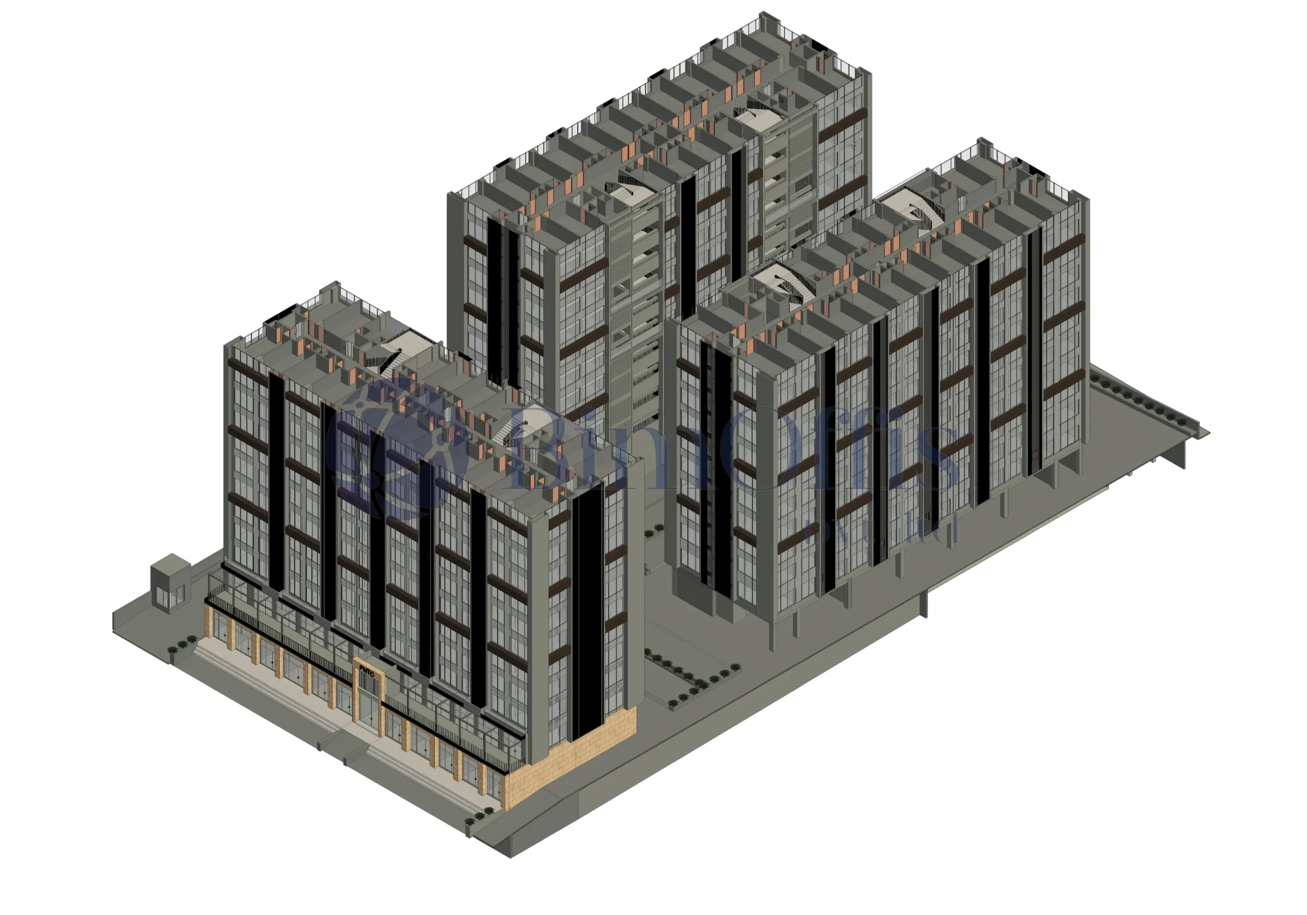 We worked on creating the architectural model in Autodesk Revit. Since it’s a 13-story building, there was a lot to manage, so the idea was to keep things clear and not overcomplicate the model.